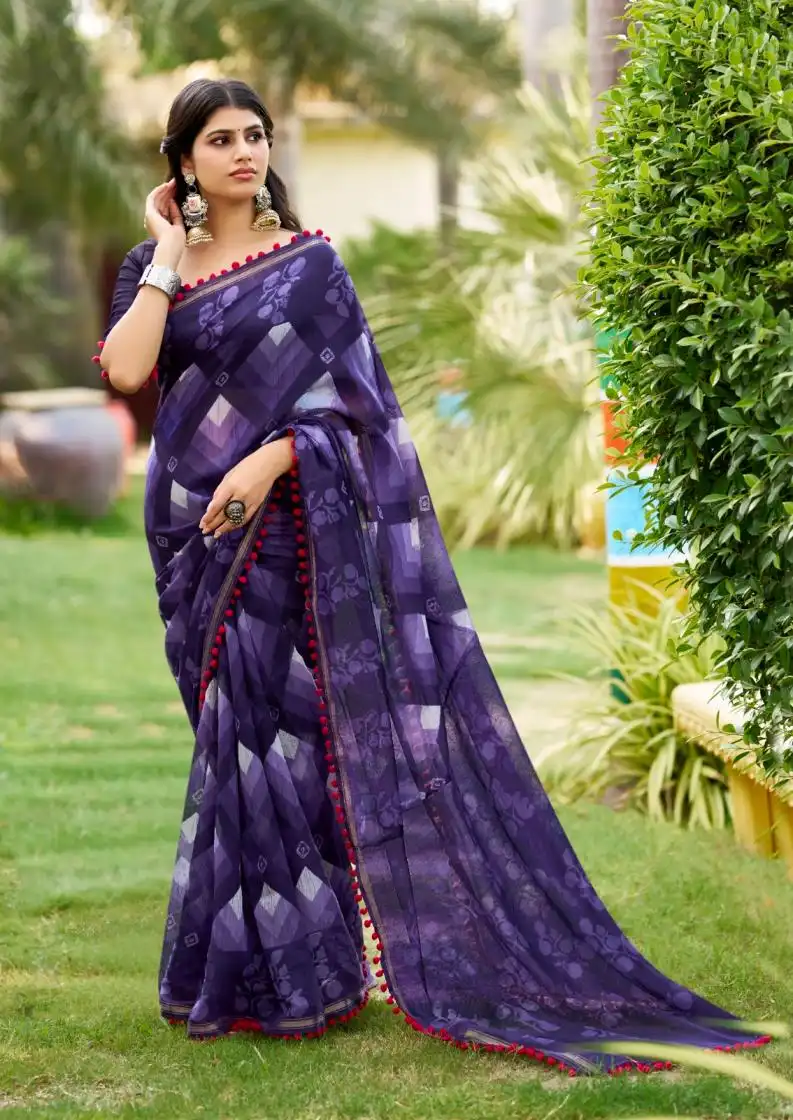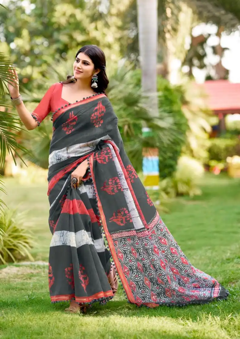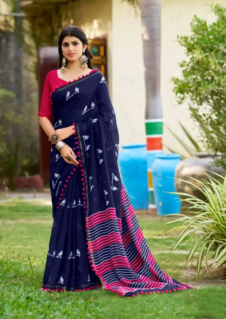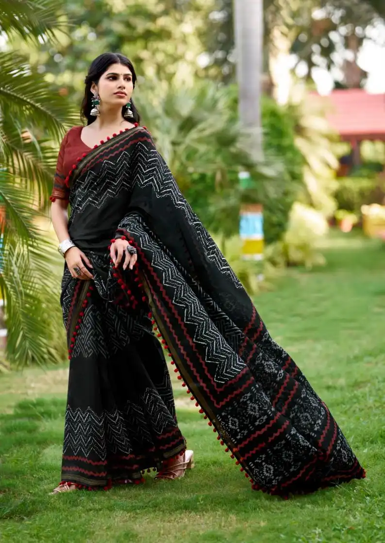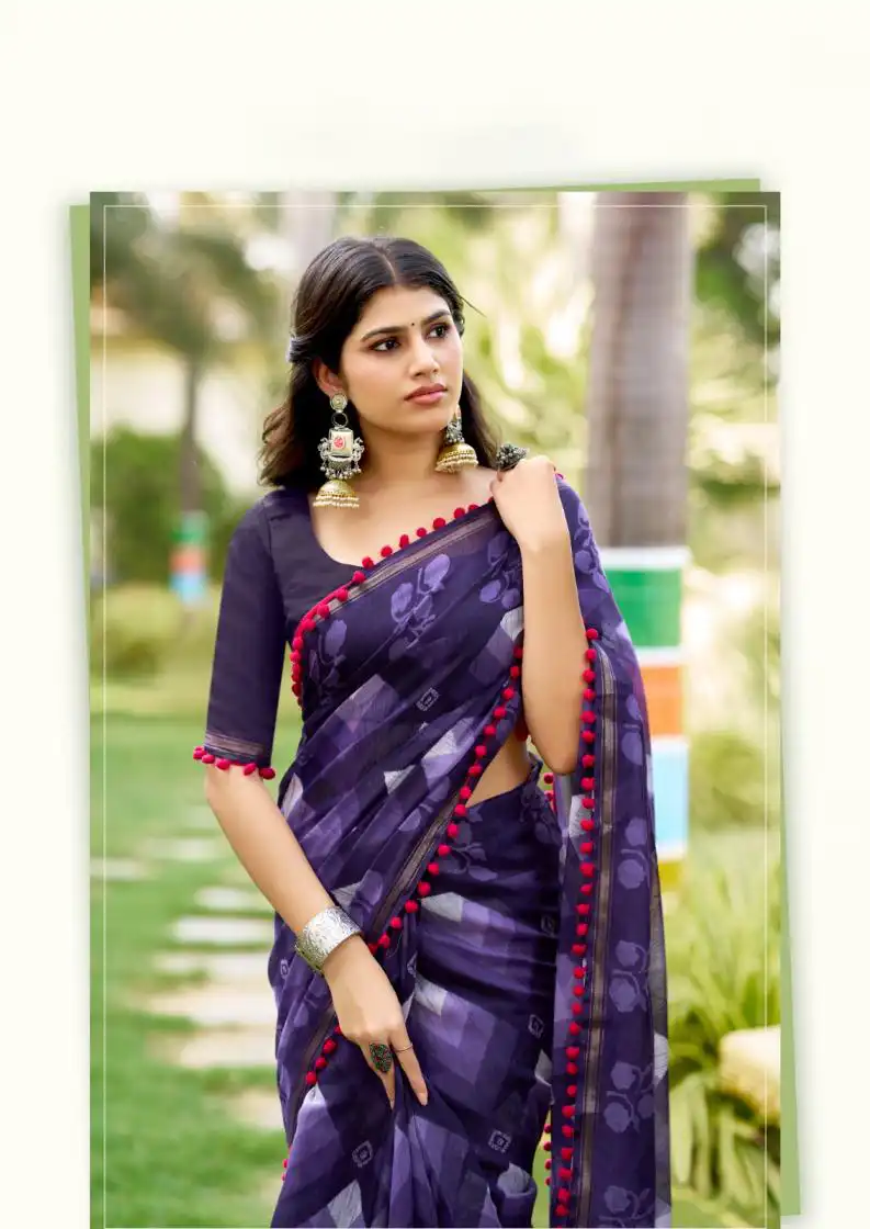 Wrap yourself in breathable beauty with this elegant Mul Mul Cotton Saree with pom pom lace, designed for effortless everyday style. Made from feather-soft mul cotton, this Saree features a charming pom-pom lace border that adds a playful ethnic twist to its subtle and graceful look.